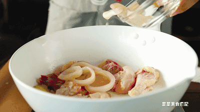 3.热锅下油,爆炒鸡肉、鱿鱼。