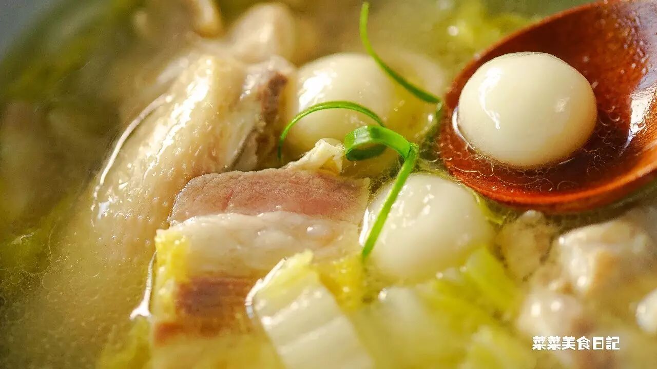 菜菜第一次吃东莞咸丸,是在东莞的一个朋友家。上桌一大锅,丰富极了。鱿鱼、腊肉、鸡、娃娃菜,主角则是白胖胖的糯米圆子。