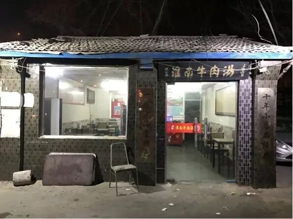 这家牛肉汤开在四环外广渠路边一个建材市场入口左侧,这个小平房屹立在一条小水沟旁,五年了。