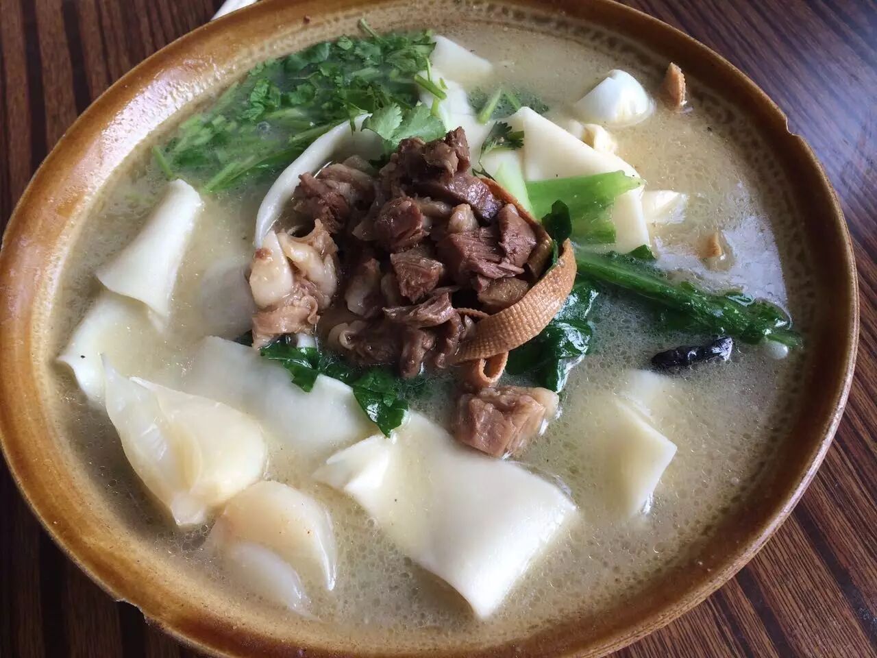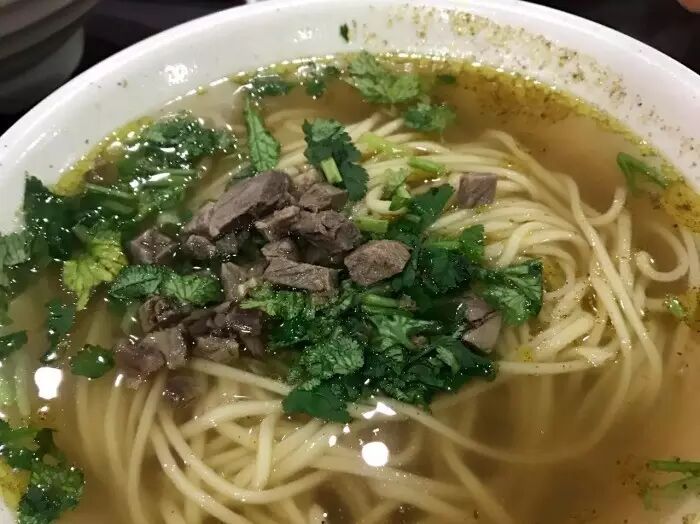 店铺不大,饭点时候常常还要排个队。目前牛肉汤大碗12元,小碗10元。滚热的牛肉汤扑面而来的是辣椒的辛香,加上葱,蒜,香菜的味道交融在牛肉汤里,一口下去,味蕾瞬间被打开。汤里豆腐丝和粉丝,分量足;粉丝是红薯粉里面加了魔芋,吃起来更劲道;几片黄牛肉,算是证明了自己的身份是牛肉汤。