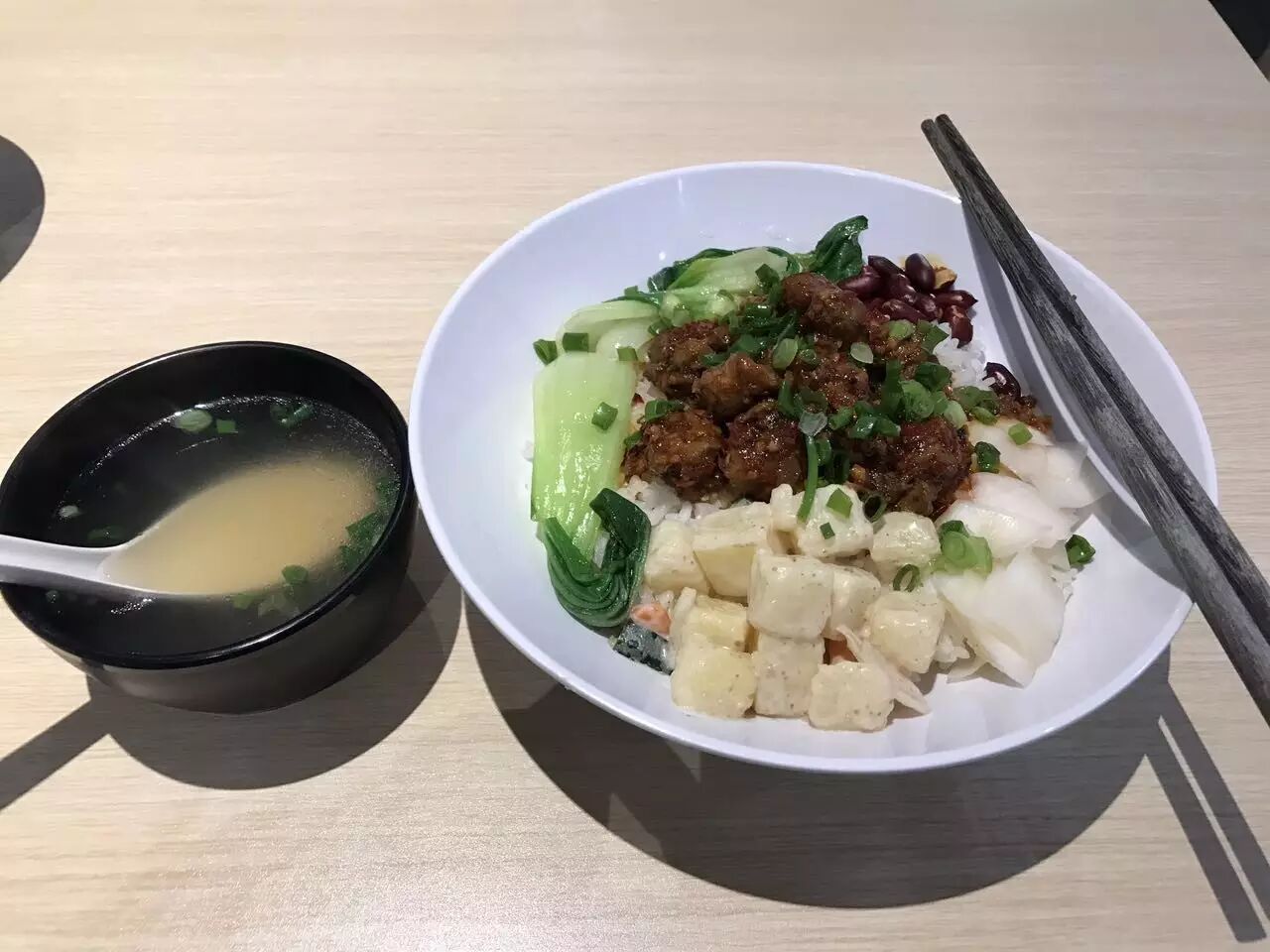 辣子鸡饭配土豆沙拉,还有一碗猪骨汤