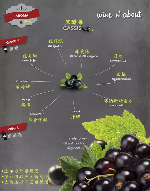 黑醋栗香气是红葡萄酒中相对常见的香气,在使用赤霞珠(Cabernet Sauvignon)酿制的葡萄酒中,这种香气尤为明显。除了赤霞珠葡萄酒以外,黑醋栗香气在一些由其他品种葡萄酿制的葡萄酒中也可以闻到,如佳丽酿(Carignan)、佳美娜(Carmenere)、歌海娜(Grenache)、梅洛(Merlot)、慕合怀特(Mourvedre)、西拉(Syrah)、丹魄(Tempranillo)和丹娜(Tannat)葡萄酒等。