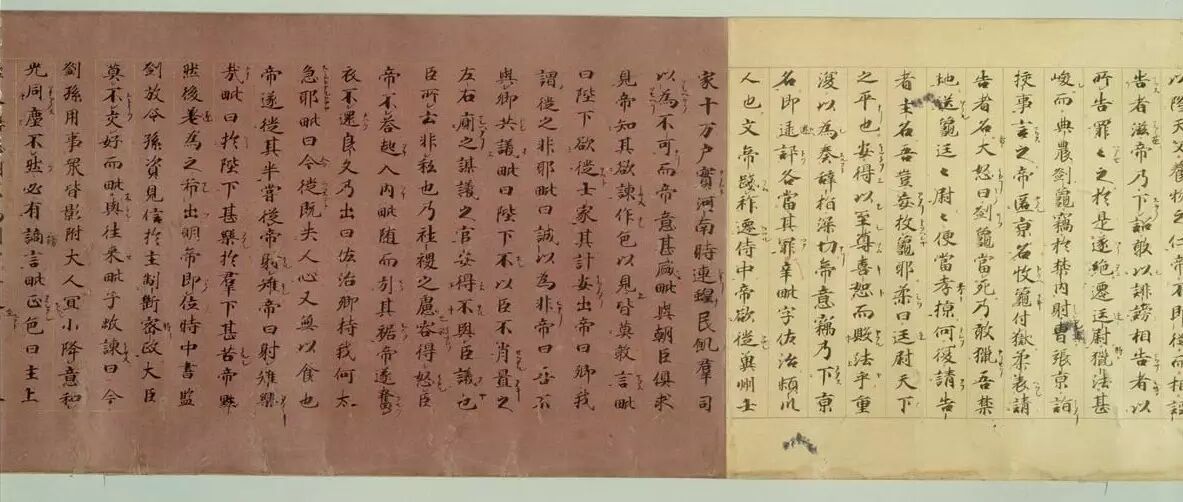 幸好,这部书在唐朝被遣唐使带到日本后,立即在皇室和重臣里面惊起一滩鸥鹭,成为日本学习中华文明的重要典章,并被多次翻印。孔子曰过:礼失求诸野,说的可不就是这回事儿吗。在东京国立博物馆二楼的一间幽暗小室中,一个长长的玻璃展示柜里,我目光如炬的看着这本“死了”1000多年,链接着诸多传说的手抄本。卷轴很长,大概有6、7米的样子,用不同颜色的纸进行正楷抄录,今天看到的是存世的最古老的版本,11世纪的,当然这次只展出了第31部《六韬治要》,她也是“子”部的开篇。