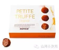 ROYCE是去日本的朋友在机场老看见的品牌,尤其是他家的生巧,我也喜欢。记得有一年情人节,恰巧出差,从日本回上海。有点落寞时,买了一盒酒味的生巧上飞机,然后……我居然吃醉了。但今天要推荐的,是我的最爱——橙子味松露巧克力。橙子味非常浓郁,但一点不掩盖松露巧克力的滋味,只有一个缺点——太少了!除了橙子味,还有樱桃白兰地版本和胡桃口味。