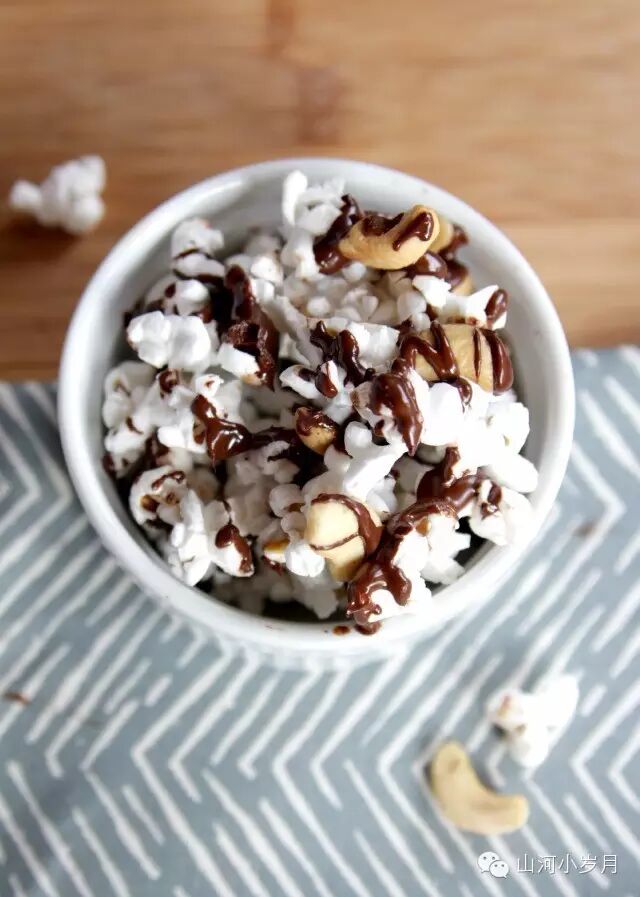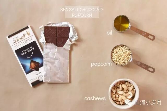 上面的图是一个菜谱,用海盐味巧克力做出来的巧克力爆米花坚果,我试做过,聚会时最快被消灭的一个小吃。