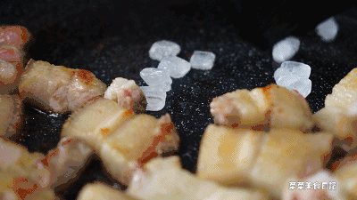 2.待五花肉表面微微焦黄,油已渗出,就可以加入小颗的冰糖,翻炒至完全溶解。