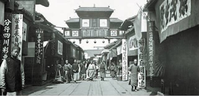 ▲ “穷街陋巷”。传教士摄于晚清成都穷人生活的一个小胡同。胡同的中心铺了石板,以供推“公鸡车”使用。