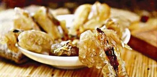 既然雪蛤本身是指林蛙,那么我们平常食用的"雪蛤"是指哪里呢?我们平常所吃的,其实是雌蛙输卵管的干燥物,原本被称之为"雪蛤油",是名贵的食品、补品、药品,具有"滋补益精、养阴润肺、补脑益智"等功效,自古在民间就被誉为与东北三宝齐名的传世滋补佳品。由于林蛙油的意义大于林蛙本身,时间长了,就干脆直接称为将林蛙油称为"雪蛤"。最好的时候就是十月底下第一场雪的时候,此时林蛙储存了足够的能量准备冬眠,因此雪蛤油是甜润的。过了十一月就开始发苦,而等到开春,就该产卵了。
