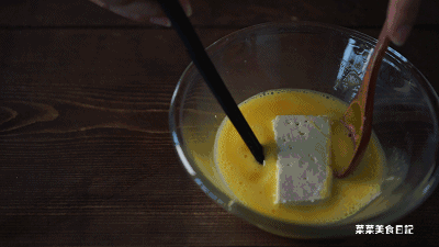 4.鸡蛋打散,让豆腐均匀裹上蛋液。