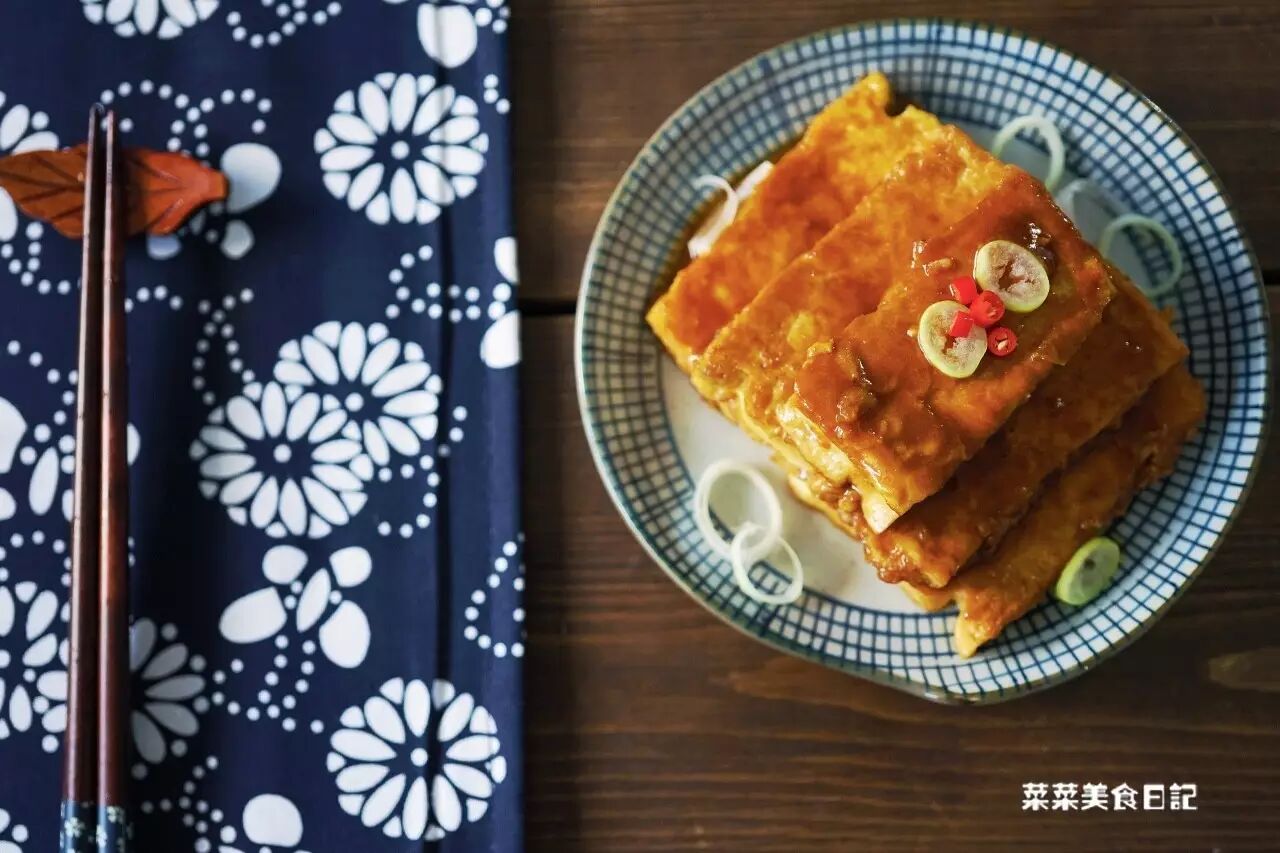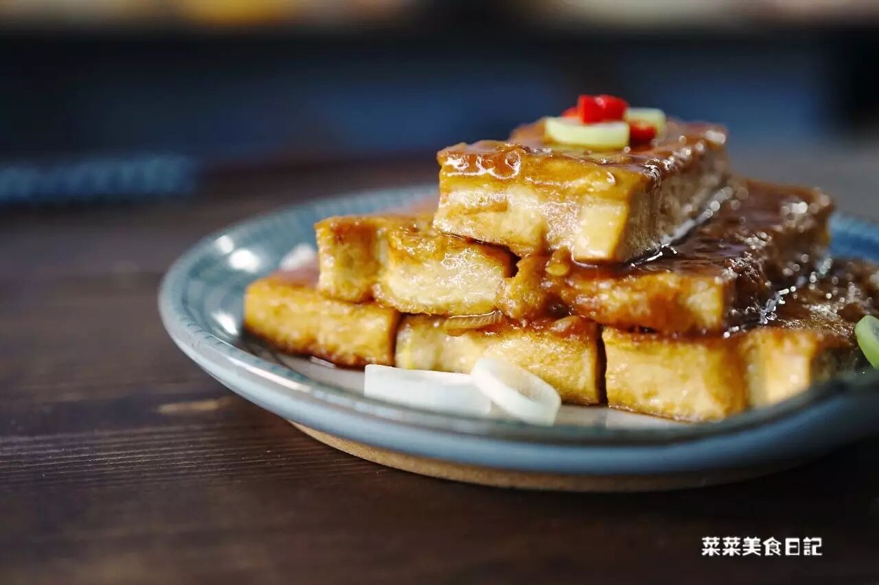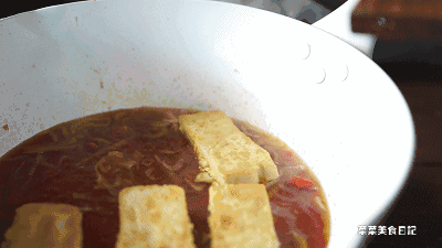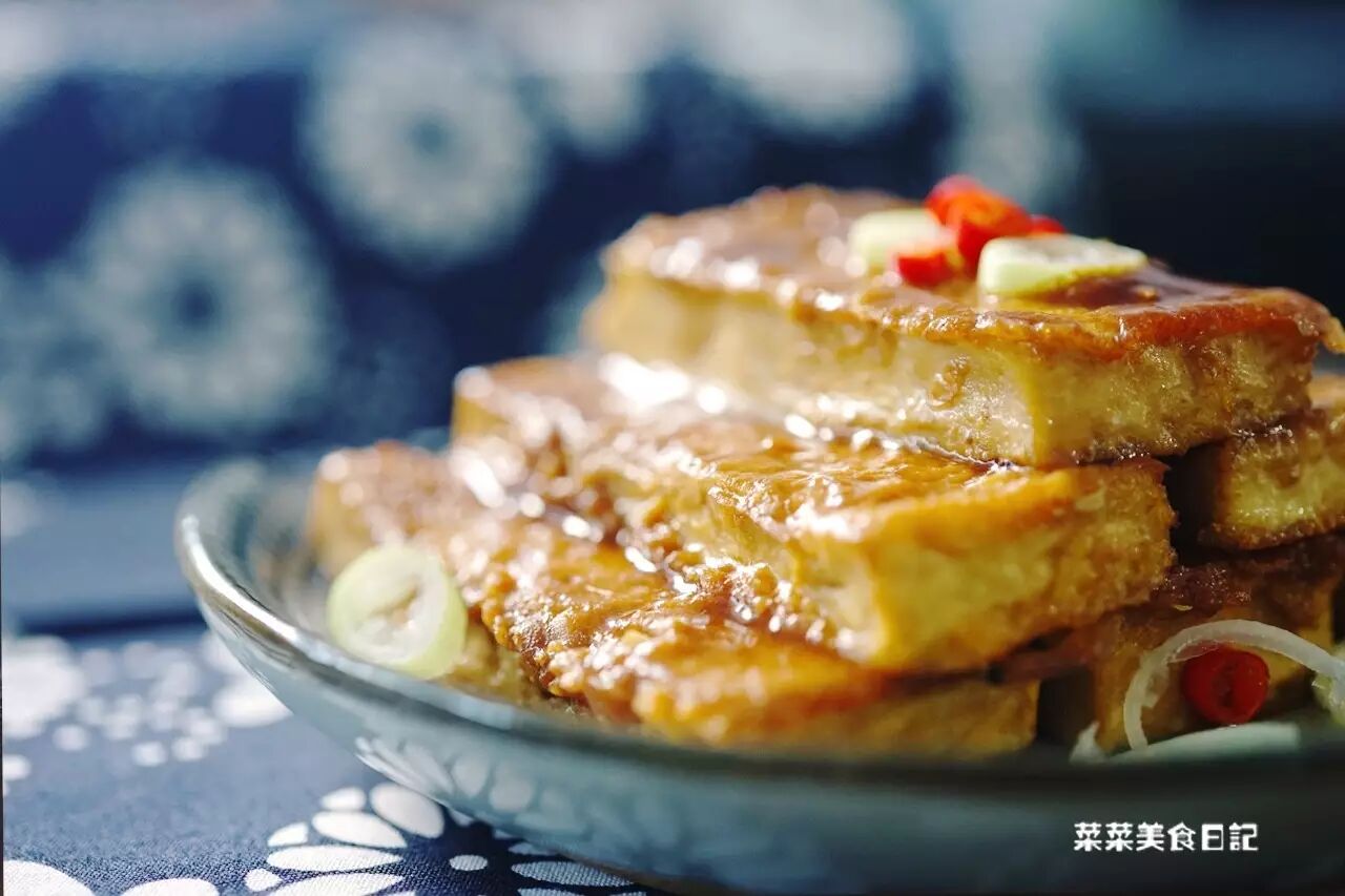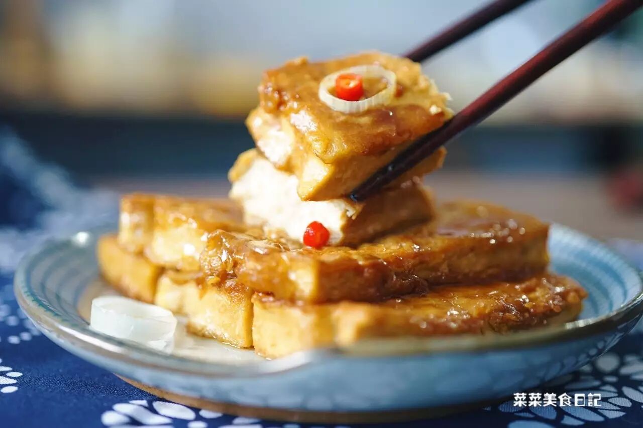 它的质地比较紧实,煎的时候不易散架,还能吸饱汤汁的滋味。豆腐里吸足了汁,趁热拣一块,外皮香而柔韧,里面的豆腐嫩而入味。