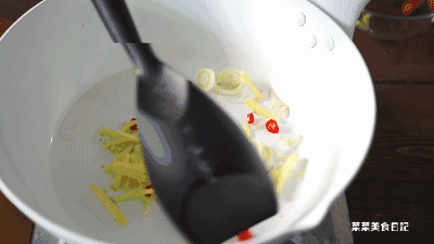 6.重起油锅,加入姜丝、葱、小米椒和虾皮炒香。