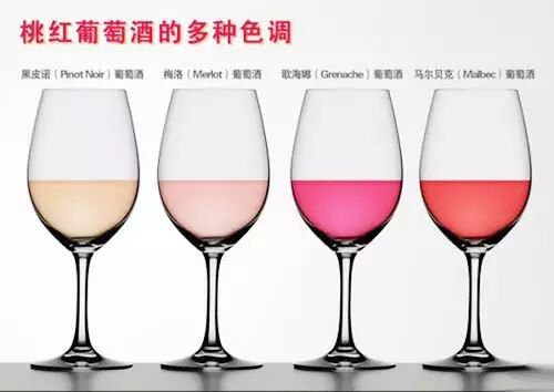 桃红葡萄酒:用带色的红葡萄带皮发酵或分离发酵制成。酒色为淡红、桃红、橘红或玫瑰色。凡色泽过深或过浅均不符合桃红葡萄酒的要求。这一类葡萄酒在风味上具有新鲜感和明显的果香,含单宁不宜太高。玫瑰香葡萄、黑比诺、佳利酿、法国蓝等品种都适合酿制桃红葡萄酒。另红、白葡萄酒按一定比例勾兑也可算是桃红葡萄酒。