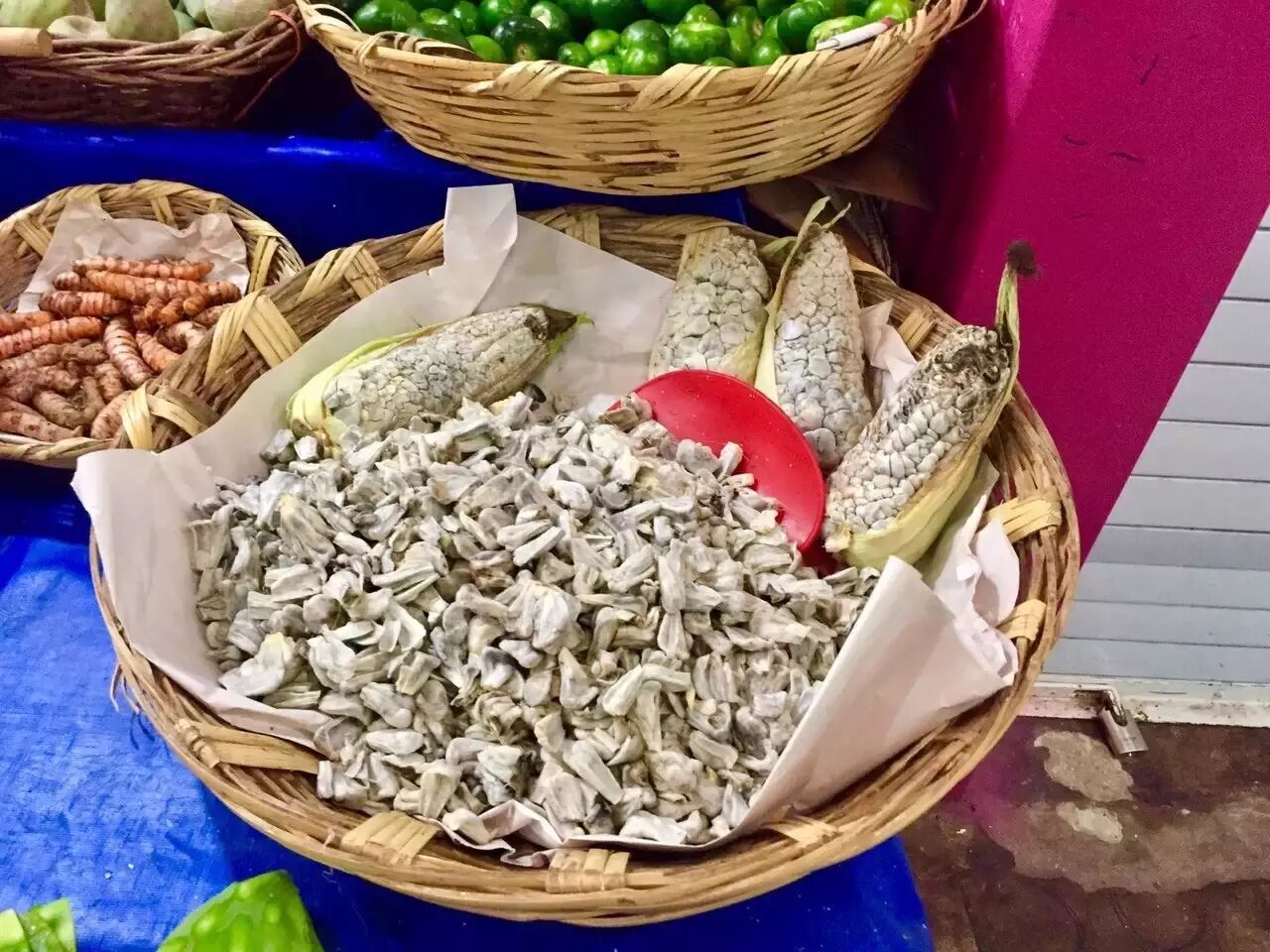 在la Merced,市场上基本每个蔬菜摊位都会有一两个新鲜玉米瘤,有的大一些的摊位还会有一个簸箕,里面装满了掰好的黑色病变玉米瘤。当地朋友的爸爸告诉我,在他们这里,Huitlacoche其实挺贵的,被媒体号称是玉米松露,不是人们天天会去买的食材,一般都是在小铺子里面吃。而且也得看小铺的菜单,大多数也是不会有的,因为保质期很短,只能在最鲜嫩的时候吃,干了就没意义了。而且价格也不便宜,所以不是每个店铺都愿意进。