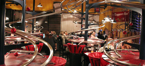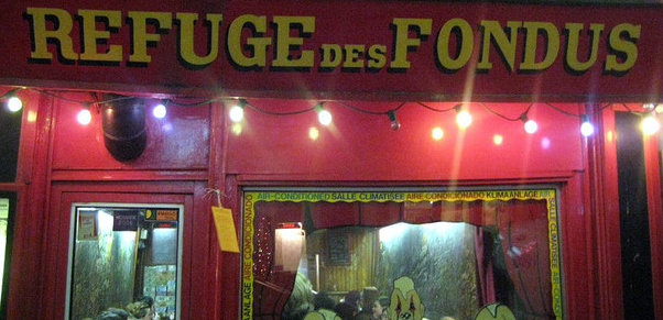 从外面看起来,它可能有点像奢侈的嘉年华,但是它的菜单很简单。大部分火锅餐厅都一样,只有两种选择:红酒或白酒,起司或肉类。但是这个餐厅就有点古怪了。在巴黎,以酒杯盛装的葡萄酒是要收税的。为了绕开这一规定,避难所火锅(Le Refuge des Fondues)将红酒都用防溢婴儿奶瓶装。几个朋友一起吮吸塑料奶嘴的乐趣往往会加速红酒消费。如果酒后你想涂鸦一番,你的周围还有一大面满是涂鸦的墙。