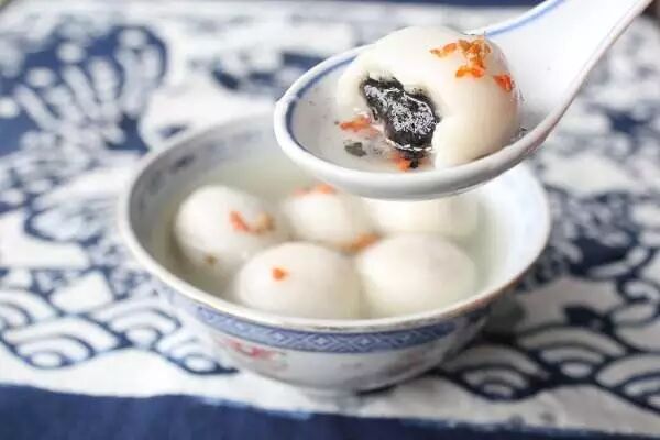 宁波汤团始于宋元时期,已有700多年历史。做法有点儿像包饺子。先把糯米粉加水和成团(跟做饺子时和面一样),放置几小时让它“醒”透。然后把做馅的各种原料拌匀放在大碗里备用(不须像做元宵那样切成小块)。汤团馅含水量比元宵多。包汤团的过程也像饺子,但不用擀面杖。湿糯米粉粘性极强,只好用手揪一小团湿面,挤压成圆片形状。用筷子(或薄竹片状的工具)挑一团馅放在糯米片上,再用双手边转边收口做成汤团。做得好的汤团表面光滑发亮,有的还留一个尖儿,像桃形。汤团表皮已含有足够的水份,很粘,不易保存,最好现做现下了吃。