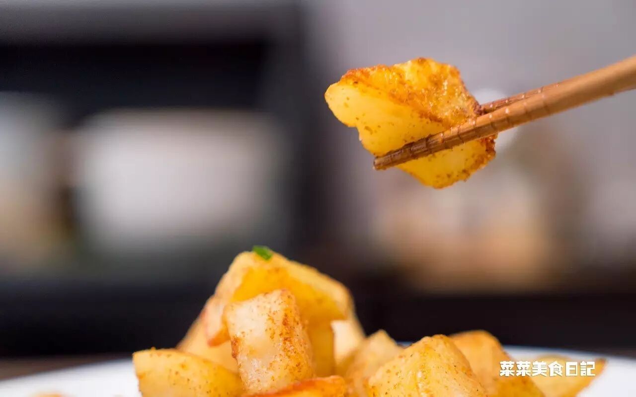 将煮熟的土豆块儿,慢慢煎出金黄色的锅巴,再趁热撒入辣椒、孜然、花椒等。既焦香入味,又香辣过瘾。当零嘴,或用来下饭皆可。