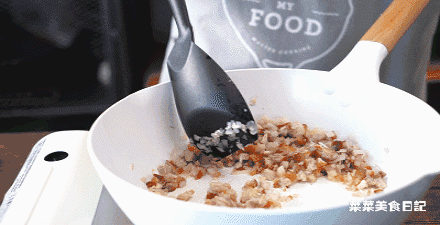 5.炒出香味后倒入切碎的肉翻炒均匀,入加少许卤水一起翻炒,出锅前加盐调味即可
