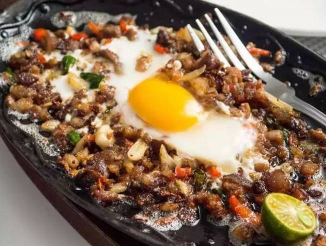 猪肝和猪脸肉先用盐水煮过,再经过油炸或炙烤,然后切成碎丁,与洋葱、辣椒和菲律宾土产酸橘,放在滚烫的铁板上混炒而成,最后还要再敲入一个鸡蛋。