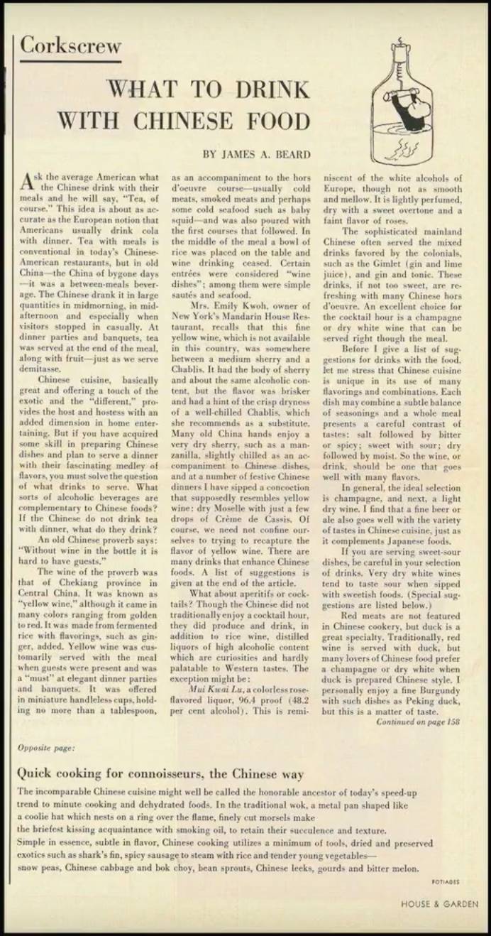 比尔德曾经撰写的杂志专栏:吃中国菜该喝啥酒