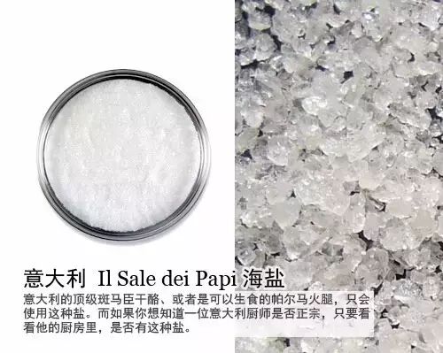 Il sale dei Papi的意思是大主教的盐,它是意大利人的盐之花,产自切尔维亚(Cervia)和其它的海盐相比,Il sale dei Papi 以它的口味温和、绵软、回味甘甜著称。而如果你想知道一位意大利厨师是否正宗,只要看看他的厨房里,是否有这种盐。