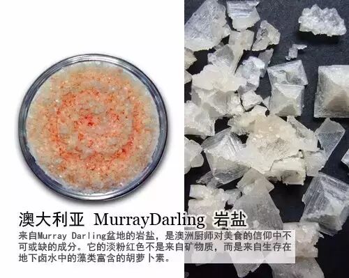 这种来自Murray Darling盆地的岩盐,是澳洲厨师对美食的信仰中不可或缺的成分。它是用地下的岩盐卤水直接日晒结晶而成,因此有着大颗粒的金字塔外形,其外观呈现出淡粉红色。不过这并非来自于盐中所含的矿物质,而是来自生存在地下卤水中的藻类富含的胡萝卜素,这使得 Murray Darling 岩盐的风味极为特别。Murray Darling 口味就像粗犷、豪放的男人,强烈、持久,是腌制三文鱼、蓝眼鳕鱼的不二之选,也是各种海鲜的绝好搭档。