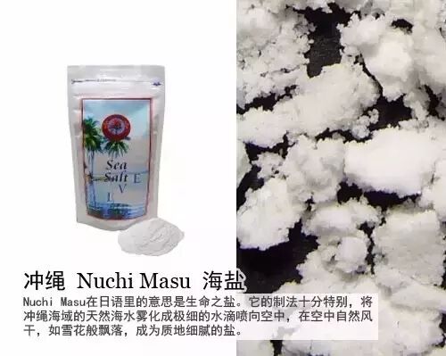 Nuchi Masu 在日语里的意思是生命之盐。它的制法十分特别:将冲绳海域的天然海水雾化成极细的水滴喷向空中,在空中自然风干,如雪花般飘落,便成为质地细腻的盐。在吉尼斯世界纪录上,Nuchi Masu 是世界上矿物质含量最为丰富的盐,它有着非常纯净的味道,在食物中溶解速度极快,是均匀调味的上选。