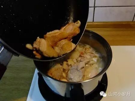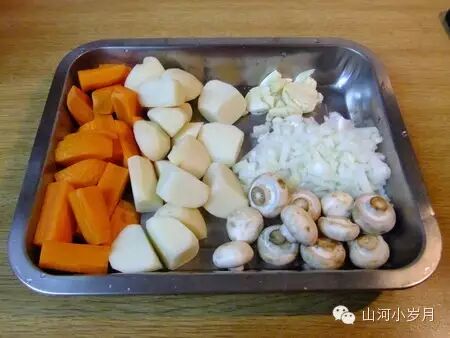 加蘑菇土豆胡萝卜,炒一炒加水。