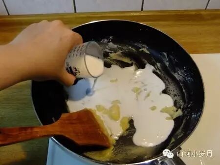 加牛奶,当然想要更罪恶,就直接加稀奶油。奢侈一点的可以加点白葡萄酒,没有也无所谓。