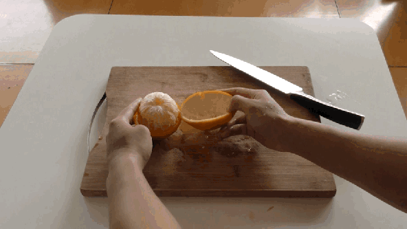 剥橙子前先滚一滚,然后从橙子中间横刀把皮切开,注意不要切到果肉。