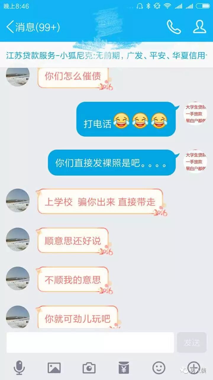 群里的“相守一生”同样在信用卡上欠了 4000 元,一个月内要还清。她现在也无计可施,找 父母,她怕,裸贷,她也怕,裸贷了,最后她也不会有钱还上。而还不上,她也不太愿意肉偿, 但是她想,还不上不愿意也不行了。 “这就是个坑。”她对我说,“只要是借裸贷的, 大部分都是跟我一样,没法还的。”