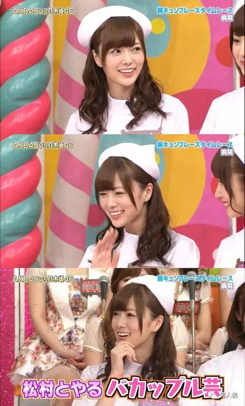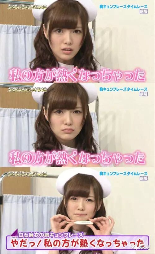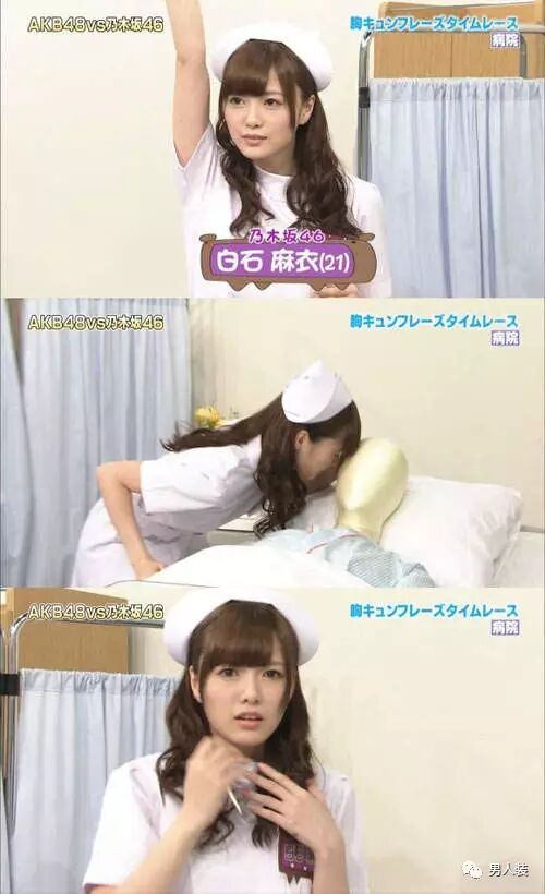 这是一次乃木坂和AKB同台竞技的节目,乃木坂直接派出几位主力穿上护士服给电视机前的全岛国观众“问诊”,结果白石麻衣靠着护士服惊艳全场,本来守着电视看AKB的宅男们迅速锁定白石麻衣,之前的“病态成见”一扫而光。
