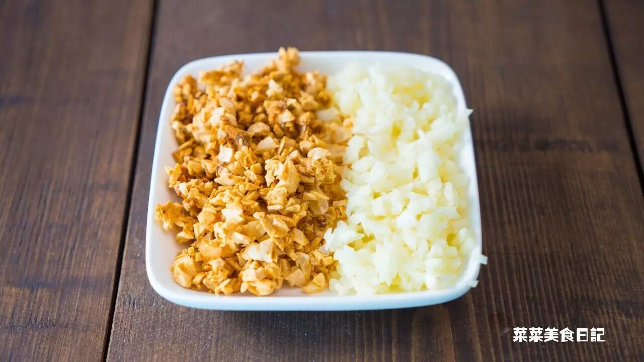 2.剥好的蒜切成蒜末,一定要切不要捣成泥。锅内加油,倒入一半的蒜末,用最小火炸成金色。