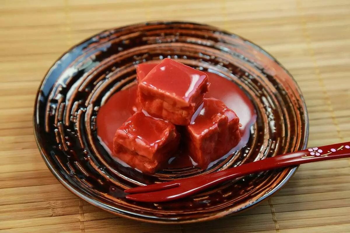 红腐乳因在制作过程中加了红曲米颜色变红而得名,北方的一般形状较大,颜色暗红,称为大块红;南方则多称为南乳,形状较小,表面富含胶质,味道浓郁。
