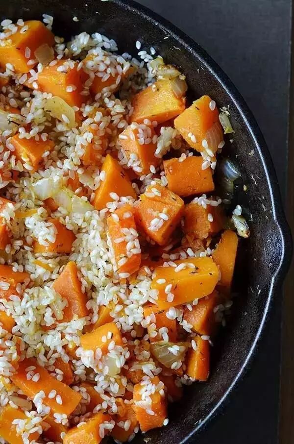 将南瓜去皮切丁,加进洋葱、三文鱼或鸡丁,与米饭一起煮,营养均衡,也不会摄入过多油脂和糖分。