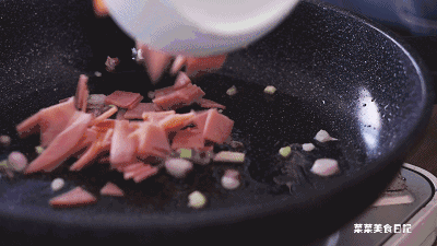 2、火腿为整锅饭提供了肉香来源,这次时间匆忙菜菜就用了普通火腿片。如果是云南贵州当地的火腿,饭的风味会大有增色。