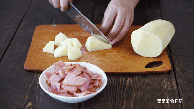 2、土豆切小块,火腿切小片。