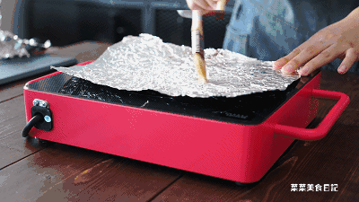 2.电陶炉加热,取锡纸稍微搓揉一下然后摊开,铺在上面,刷上薄薄一层油