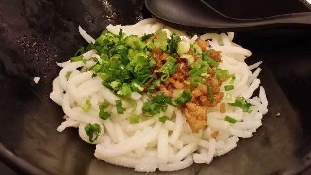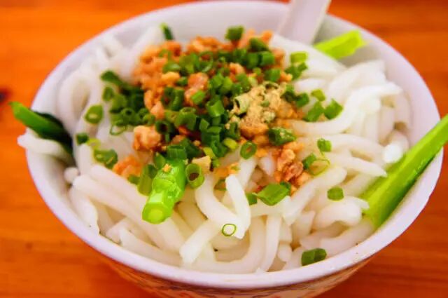 我吃过最好吃的老鼠粄,其配料比主食还金贵,鱿鱼、香菇、虾仁、肉末、笋丝下油锅爆炒,炒出香味放入老鼠粄,加水煮至水滚,撒入葱花、胡椒粉即可。