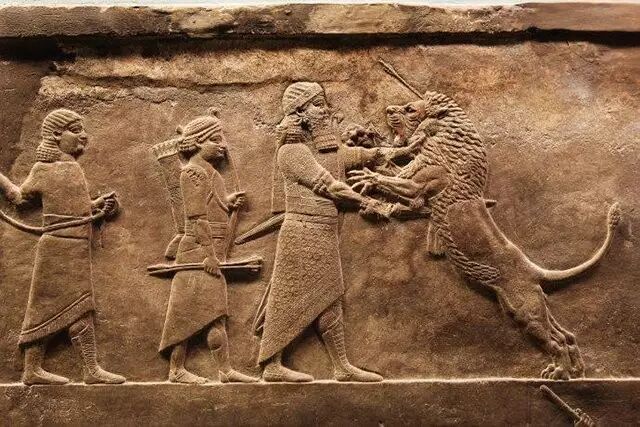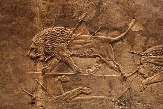 公元前7世纪,亚述王朝迁往尼尼微,尼姆鲁德开始衰落。1849年秋天,莱亚德在底格里斯河东岸库云吉克进行新的发掘,寻找古城尼尼微的遗址,发现亚述国王巴尼拔(Ashurbanipa,公元前668-627在位)的宫廷图书馆,里面藏有大量浮雕,包括国王猎狮的题材,无论猎人还是狮子的形象,都十分生动而富有力量。尤其那些中箭之狮,展现着垂死的忧伤。