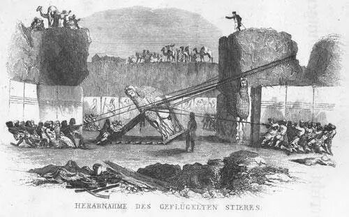 他意识到,这是和博达发掘出来的带翼牛面人首石像同类型的半人半兽像,放置在亚述宫殿门口。国王、祭司和武士都要经过这些神兽镇守的大门,向祭坛献上祭品。后来,飞狮和飞牛的巨雕相继发掘出十三对,显示出尼姆鲁德当年的宫殿何等宏伟。莱亚德声名鹊起,大大超过了博达。