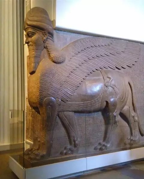据说亚述此时已进入铁器时代,当年雕琢时石块,一定是用上了铁凿。细细观察,还会发现带翼狮面人首像有五条腿,这是亚述人对于透视效果的一种奇特安排。从正面看,神兽双腿并立,从侧面看,它仍有四条健壮的腿。