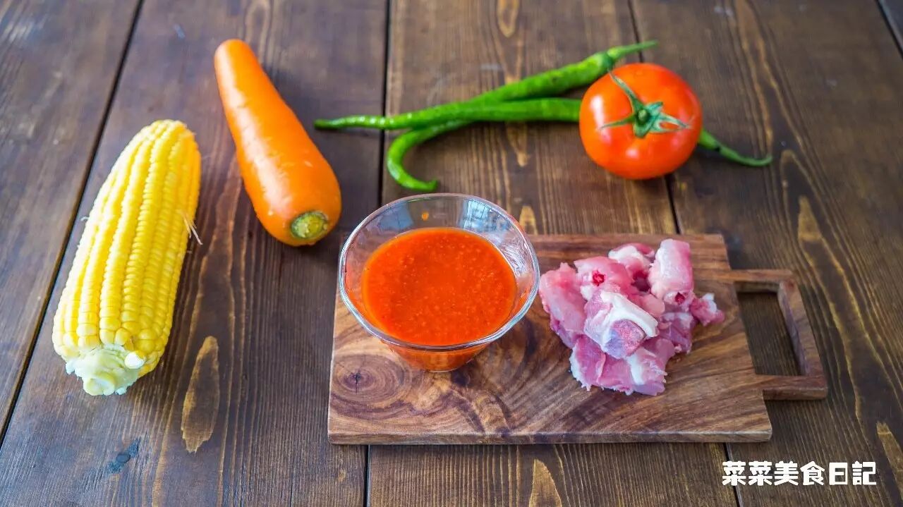 4.加入玉米、西红柿、胡萝卜一起炖煮至排骨可轻松脱骨(省时间的话也可以放进高压锅煮)