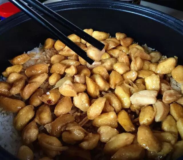 那么多鸡屁股怎么用呢?老板精挑细选之后,把它们全部焗成了一煲香喷喷的饭。美女老板端着一个硕大的电饭煲上桌的时候,我跟克平兄还有说有笑,可说时迟那时快,只见电饭煲被打开,所有人顿时平心静气地认真端详那一煲食物:足足一百个鸡屁股焗了一大煲饭。这种时候不仅仅是密集恐惧症涌上心头,一个人到底是不是真的爱吃鸡屁股?在此时就能得到考验。