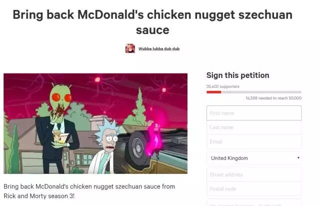 目前,热情高涨的网友们向麦当劳发了一份请愿书,大家一致呼吁希望麦当劳重新推出新的四川辣酱…目前已经达到了2万多个签名...