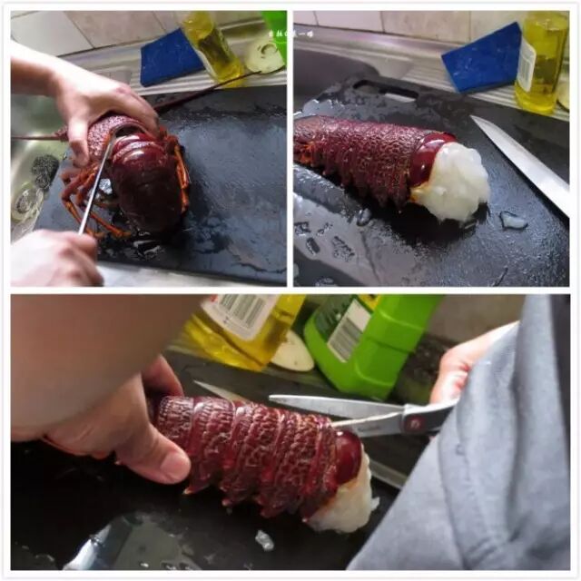 3. 剪壳,先用剪刀从龙虾的背部剪开。