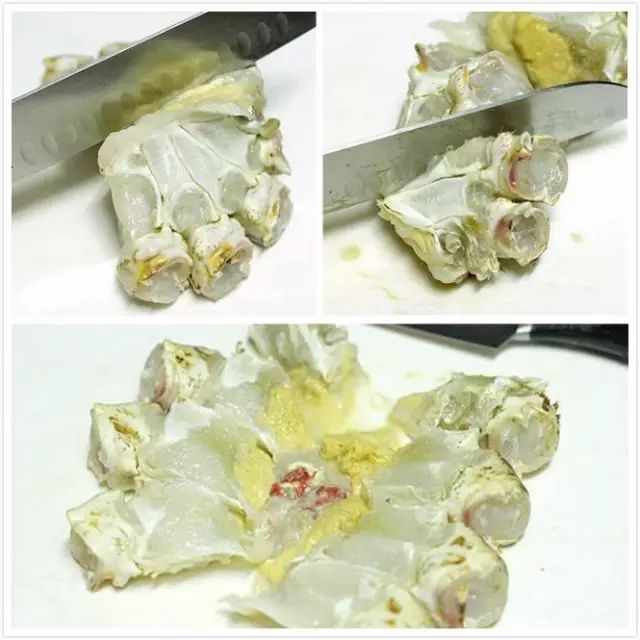 8. 最后再把螃蟹从中间一分为二剁开,再根据烹调的需要切成更小的块状即可。