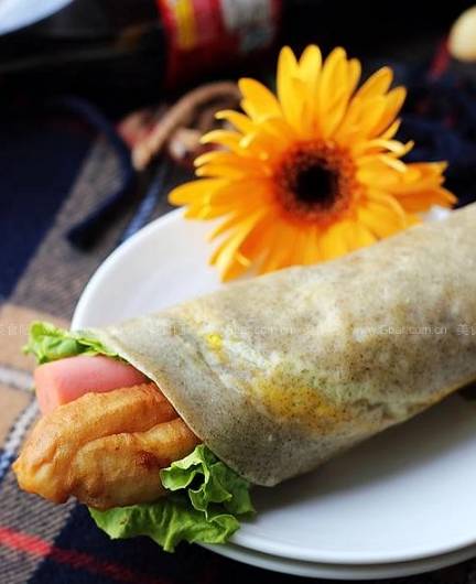 5、油条放在正中,将饼皮一面折起,盖住油条,涂上甜面酱,酱豆腐汁和辣椒酱