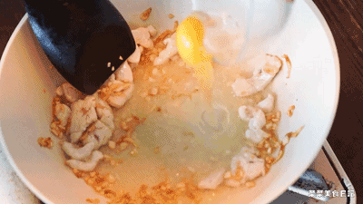 2.锅中下油,先将蒜末煸香,然后加入鸡肉和虾皮翻炒。