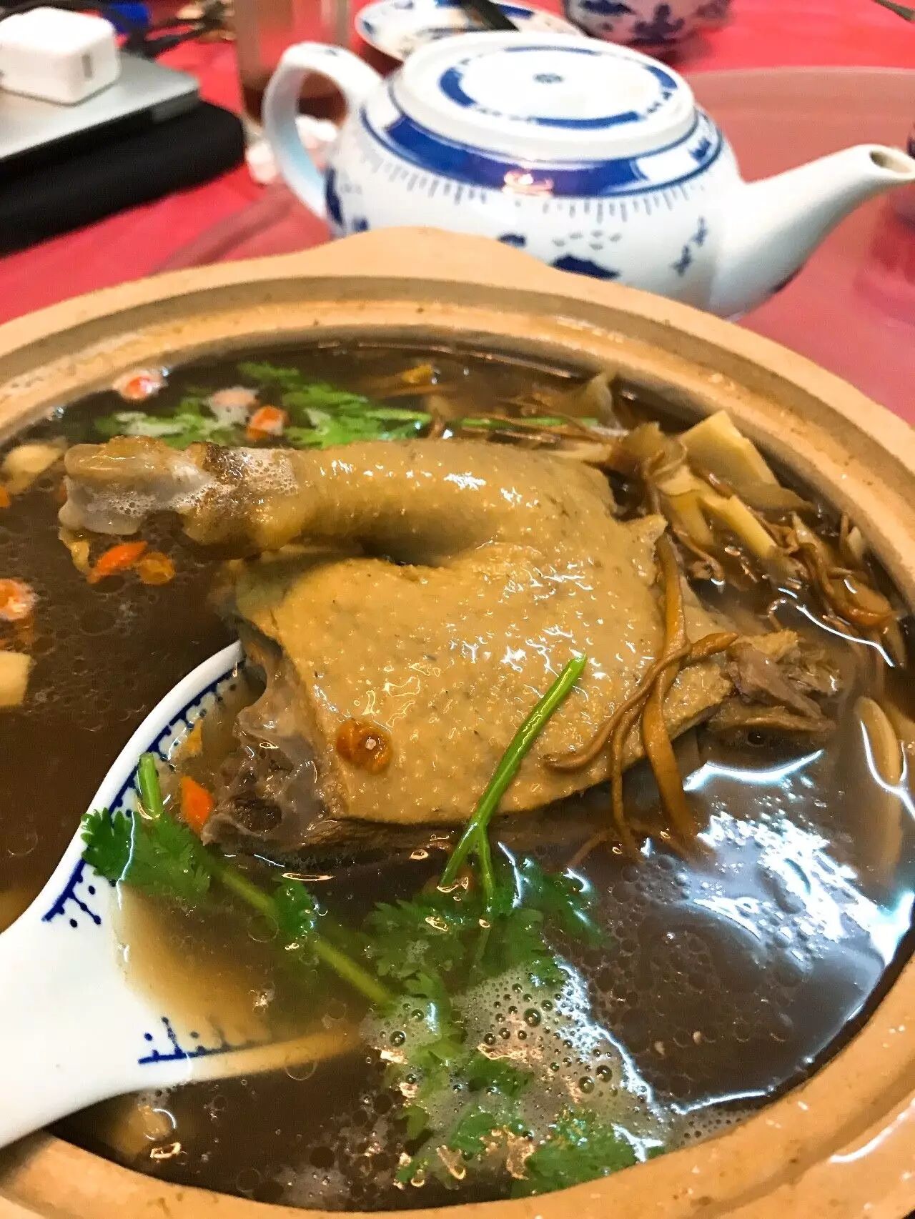 那天我们点了焦烧变蛋(把松花蛋下锅油炸,搭配上双黄咸鸭蛋)、冰糖扒蹄髈(很家常的上海味道,肉炖到酥烂)、天麻老鸭汤(也是家常做法,用的是本地麻鸭),吃到中途,小伙子给我们端上来刚刚炖好的蛇汤,说是可以用来清暑。