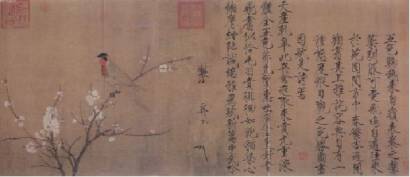 宋徽宗将画上的题款引领成常例,更使其成为画作上应有的一个内容。如《芙蓉锦鸡图》和《腊梅山禽图》两幅画上,都题有五言绝句诗一首,并题“宣和殿御制并书”一行。至于比较有名的《杏花鹦鹉图》上,在画前提上的诗序占据了画面的一半。